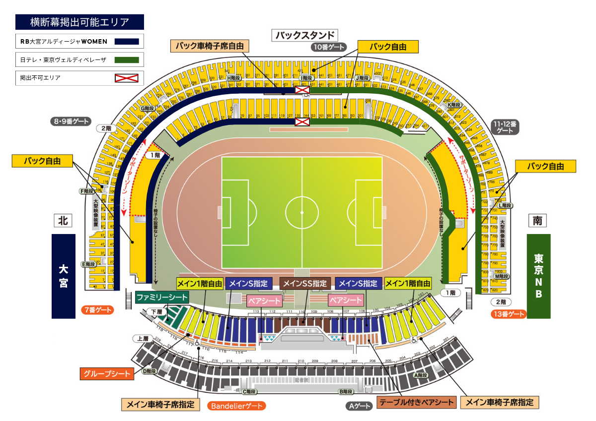 Bandieraゲート…メインスタンド各席(SS/S/ペアシート/ファミリーシート/テーブル付きペアシート/グループシート/メイン1階自由/メイン2階自由/メイン車椅子席指定)