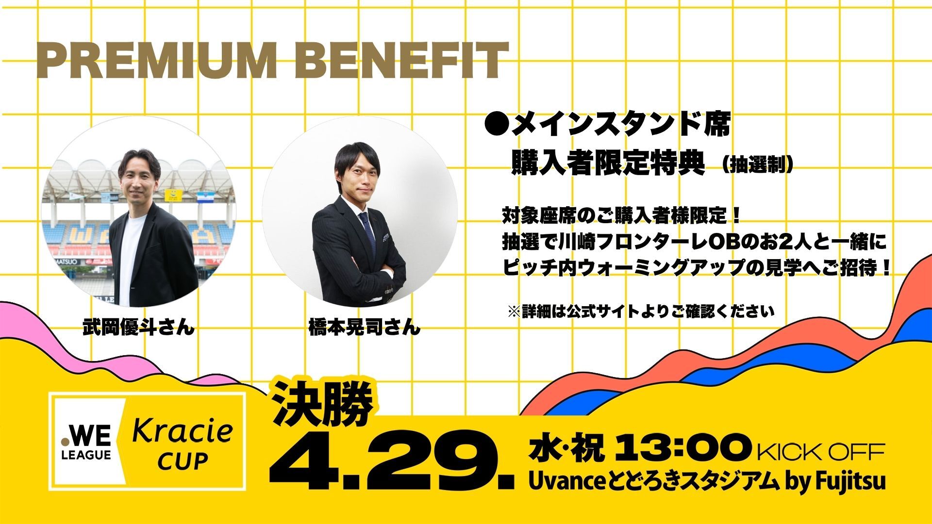 WEリーグでは4月29日(水・祝)開催する2025/26 WEリーグ クラシエカップ 決勝のチケット購入者限定特典として、U等々力を知り尽くす川崎フロンターレOB武岡さん、橋本さんと一緒にピッチ内ウォーミングアップ見学ができる特典を抽選で25組50名様にご用意!詳細は下記となります。